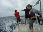 Não estava chovendo, mas o vento estava bem forte… chegamos na marina de Port Douglas, mesmo local onde pegamos o barco para a barreira de corais ontem. O barco era de porte médio, e a recepção pelos tripulantes foi muito boa – são todos muito simpáticos e prontos a ajudar a qualquer momento. Não sei se foi porque falamos que somos Brasileiros, mas eles tiveram uma atenção especial conosco, sempre procurando saber se estava tudo bem e fizeram de tudo para que nos sentissemos realizados por aquela pescaria.