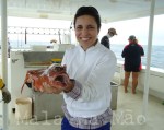 Mas a hora dele chegou!!!! uhuuuuuuu… ele pegou um peixão, que tinha uns 90 centímetros e uns 30 kilos…. ahahahaha… não, não era… brincadeira… hahahaha… mas era bem grande e bem mais legal do que todos que já havíamos pescado… só por este já valeu o passeio, e fiquei aliviada que veria meu querido voltando no fim do dia com um sorriso de satisfação no rosto! Depois pegamos mais alguns menores e mais tarde foi minha vez… peguei um belo “Coral Trout” (truta de coral) junto com um outro do Ro… os dois ficaram enroscados… coisa de marido e mulher que pescam juntos!!! Eles disseram que o Coral Trout é um dos melhores peixes para comer, e que o preço é de aproximadamente AU$45,oo/kilo!!!! Brinquei com eles e disse que iria vender na cidade e ficar rica!!! (pois é, mesmo em inglês eu continuo com minhas piadinhas… ou pelo menos tento, né!!!). Lá no barco eles limpam o peixe e congelam para você levar para casa ou, no nosso caso, hotel.