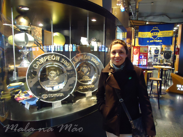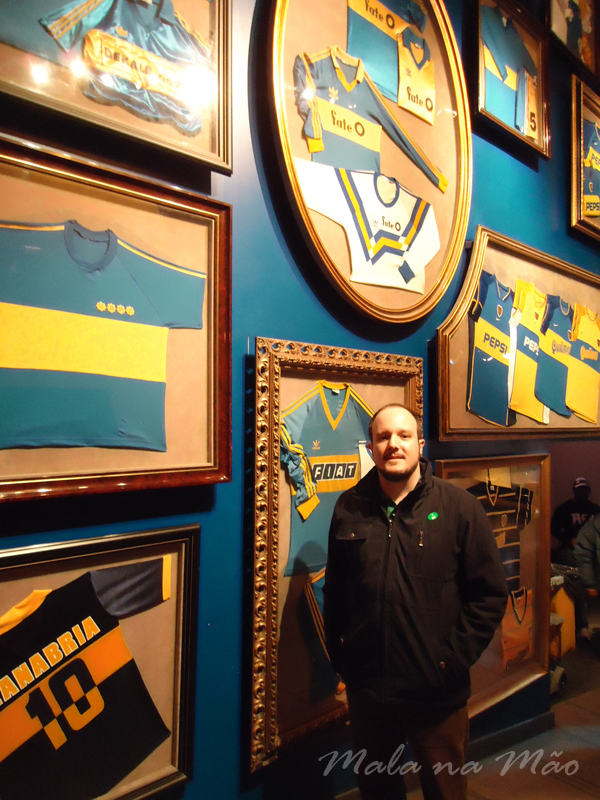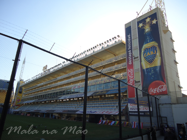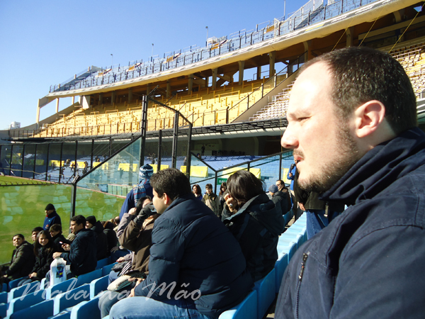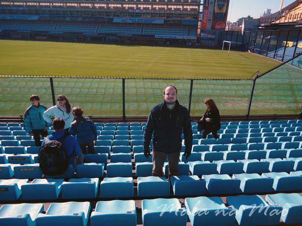 Após o café da manhã, pegamos um taxi e fomos até o Estádio do Boca Juniors, La Bombonera! Lá existe o Museo de La Pasión Boquense, e pegamos a entrada com direito à visita guiada. Foi bem bacana! Passeamos por todas as áreas do estádio, incluindo as cadeiras que são de uso vitalício (azul descoberta), as cadeiras amarelas cobertas, o vestiário do time visitante… A inclinação do estádio é impressionante! Não imaginávamos que era tanta!