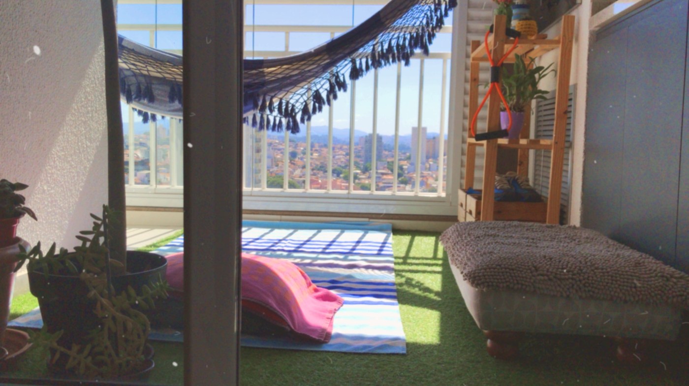 Graças a Deus, nosso apartamento tem esta varanda, pequena mas muito bem aproveitada! Já faz bastante tempo que resolvemos colocar grama sintética nesta área do apartamento… a diferença de vibe é incrível! Só de olhar pra fora e ver este “verdinho” já faz a gente relaxar! Temos uma rede também que contribui para a “malemolência” hahahaha. Aí foi só jogar as toalhas de praia na grama, almofadas e curtir o solzinho que bate pela manhã (geralmente das 10 às 12hs). Lembrete: USE SEMPRE PROTETOR SOLAR!