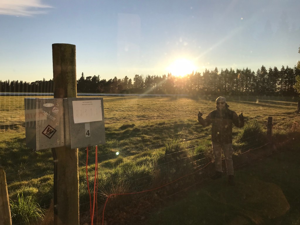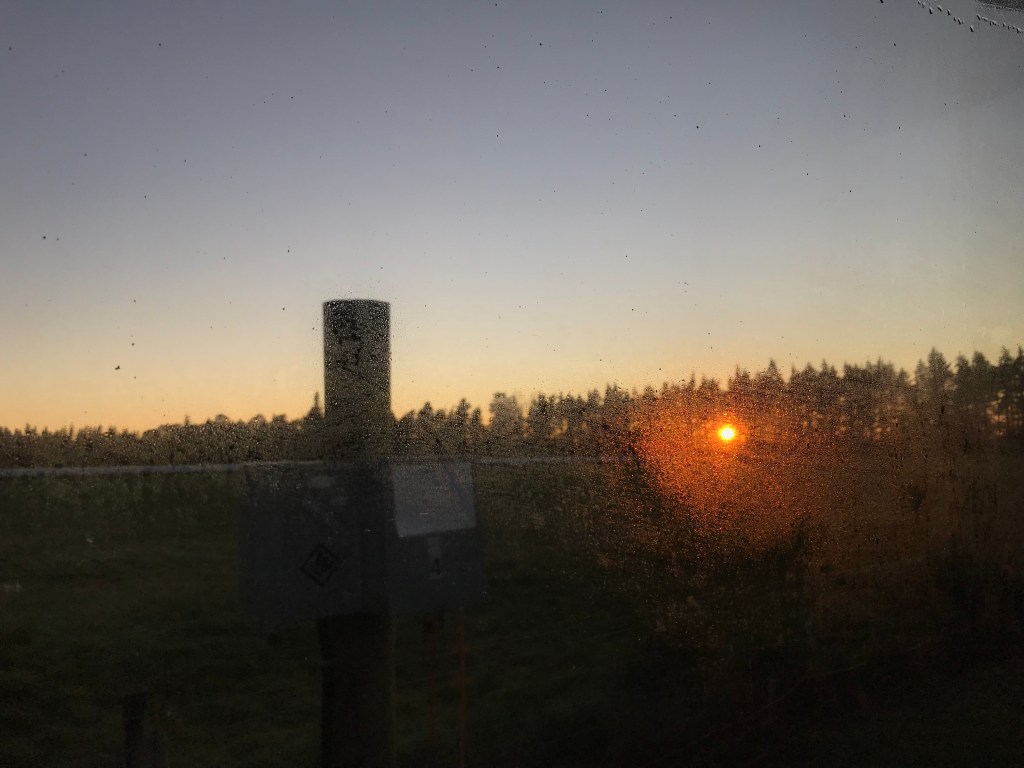 Muito frio, sim… já era começo de primavera, mas a temperatura estava muito baixa… o Rodrigo como sempre, foi o primeiro a acordar. Nossa cama ficava no fundo do carro, cercada de 3 janelas grandes… abrimos as persianas e eis aquela coisa mais linda… o sol nascendo no meio das árvores, geada no gramado, ovelhas e vacas no pasto… perfeito!