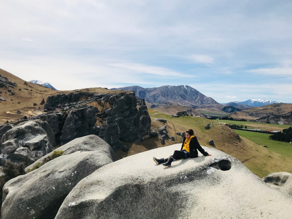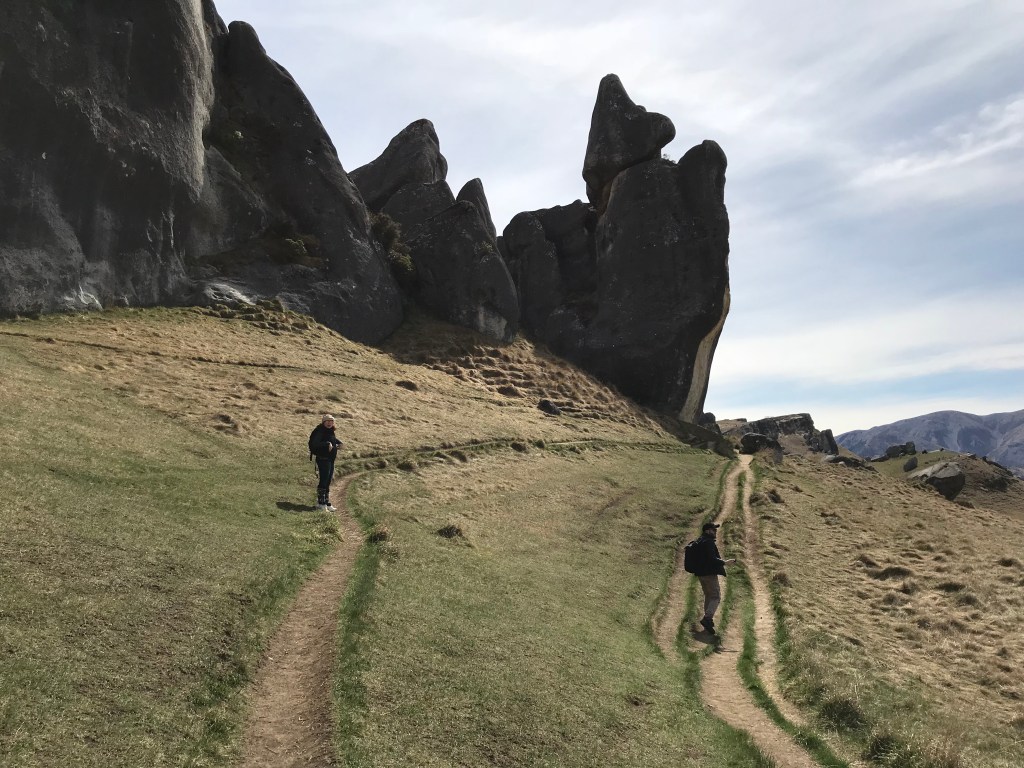 Pegamos a estrada de novo e logo avistamos um parque onde era possível fazer trecking… claro, paramos para conhecer. O nome do local é Castle Hill, e super recomendamos! O lugar é incrível, com pedras gigantes, e o passeio não é cansativo.