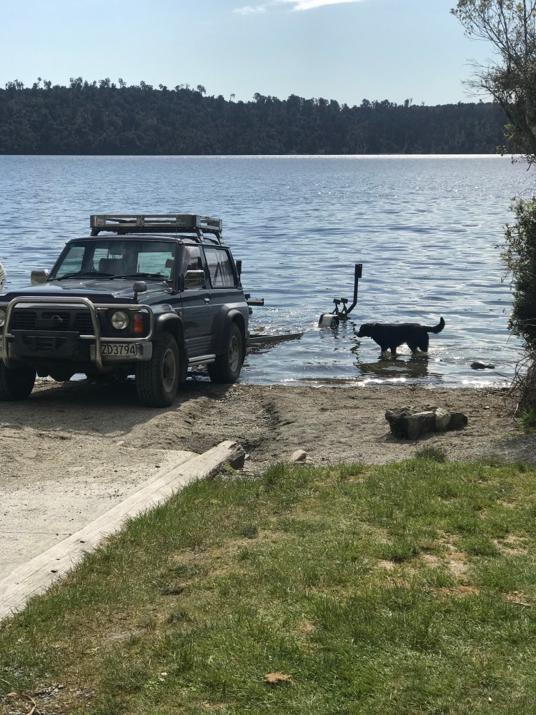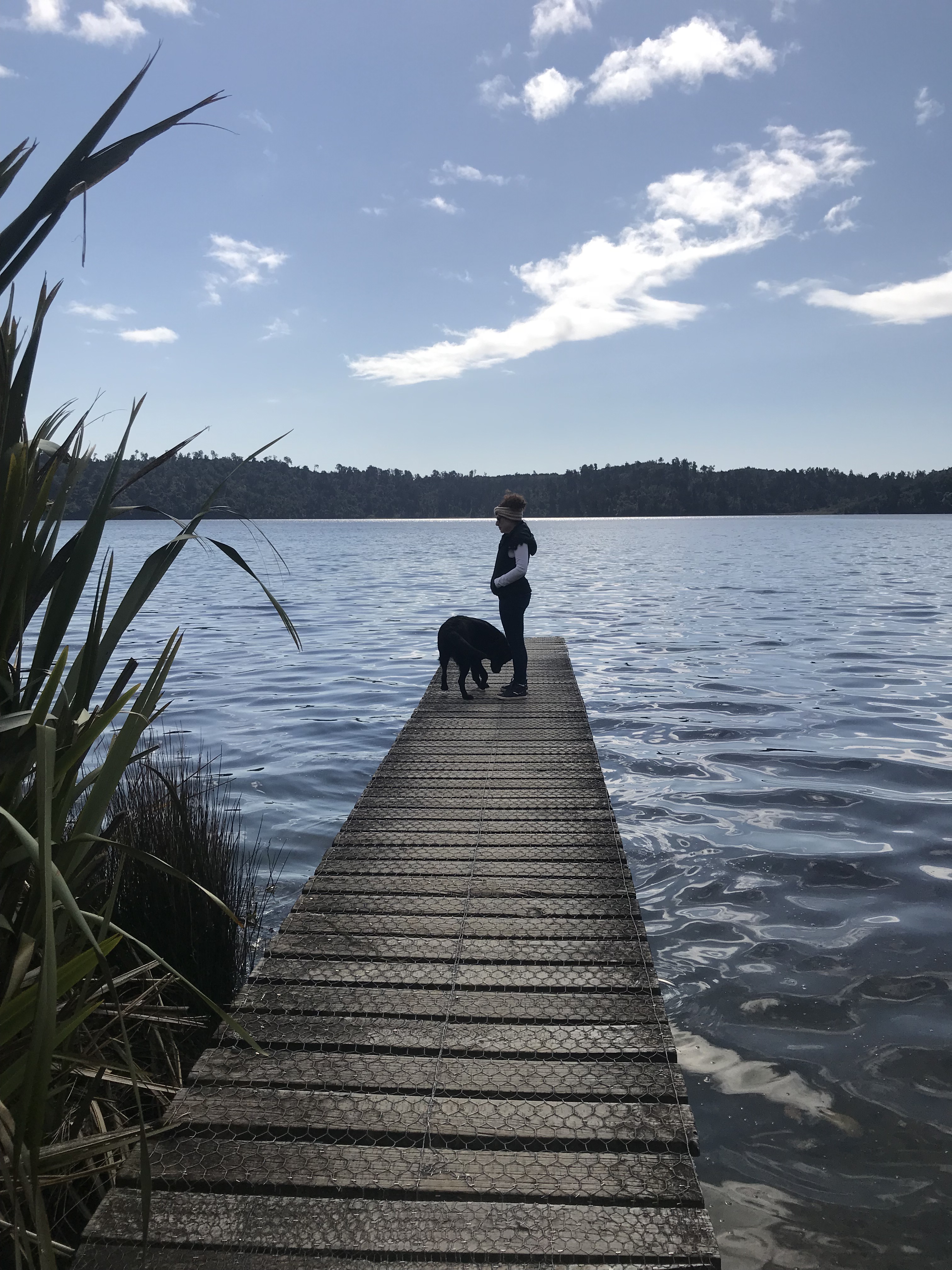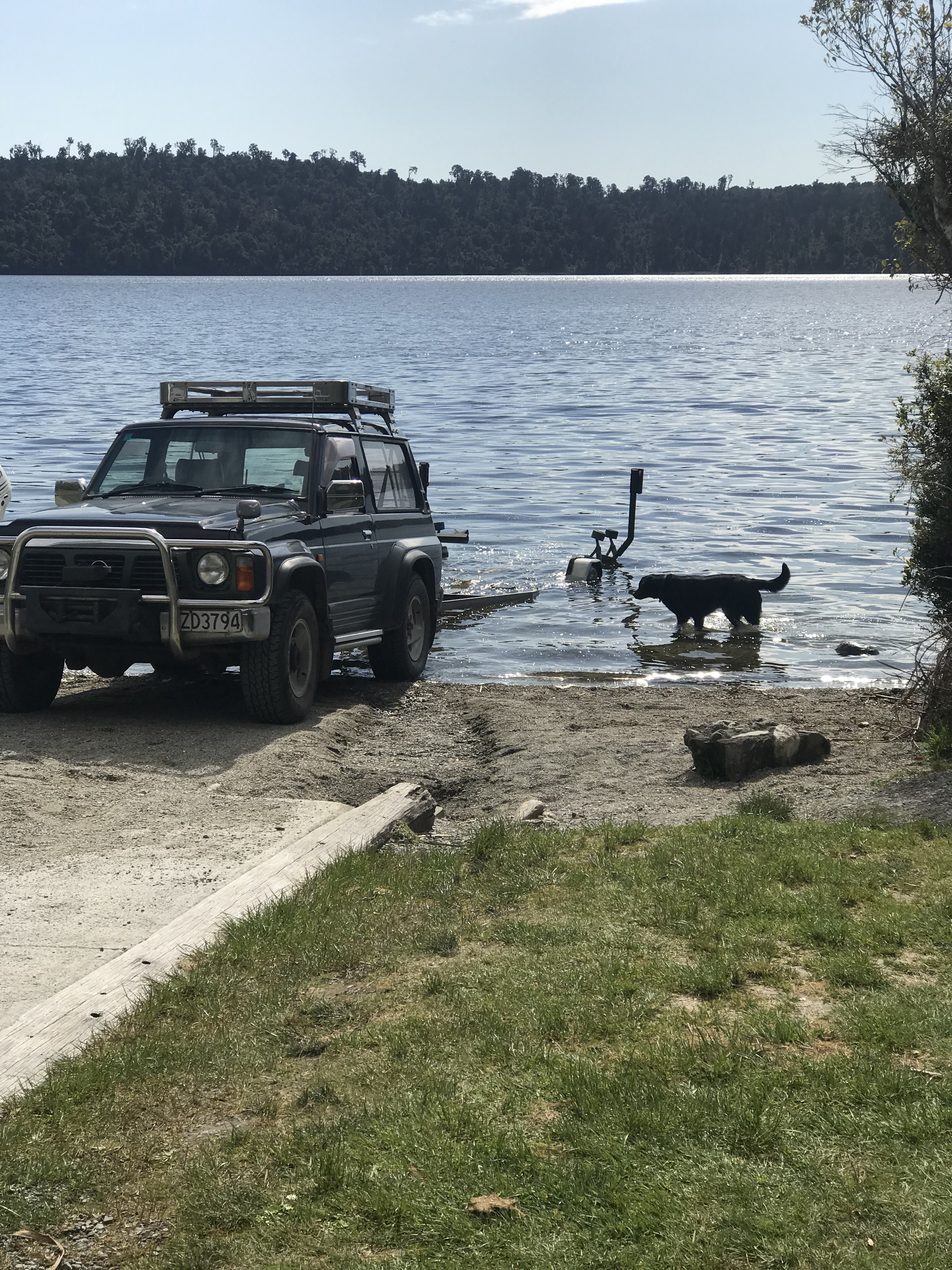 Na estrada, paramos no Lake Ianthe e acabamos conhecendo um homem que estava lá pescando em um barquinho (para nossa surpresa, “um local”!!!), junto com seu cachorro. Ele foi super simpático e quis conversar um pouco com a gente! Ele disse que plantava coisas na sua casa para comer, cria gado para consumo próprio, e era açougueiro (acho que antes de se aposentar). A mulher dele era arquiteta, mas ele disse que ela provavelmente não contrataria alguém tão “good looking” como eu para trabalhar com ela! hahahahaha