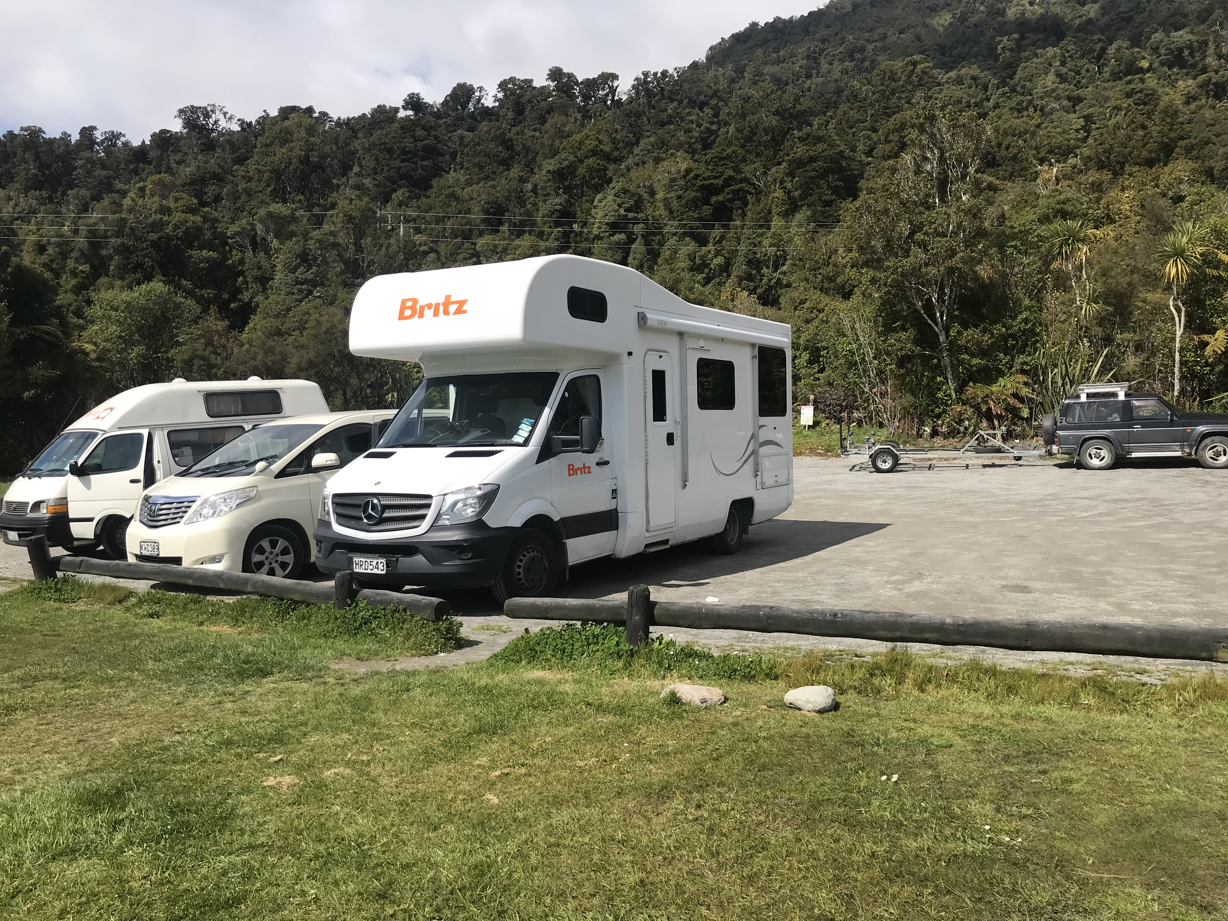Encontramos um backpacker super bacana que nos deixou ficar na vaga do estacionamento (para dormir na campervan) e usar os banheiros e cozinha deles. YHA Franz Josef Glacier Backpackers