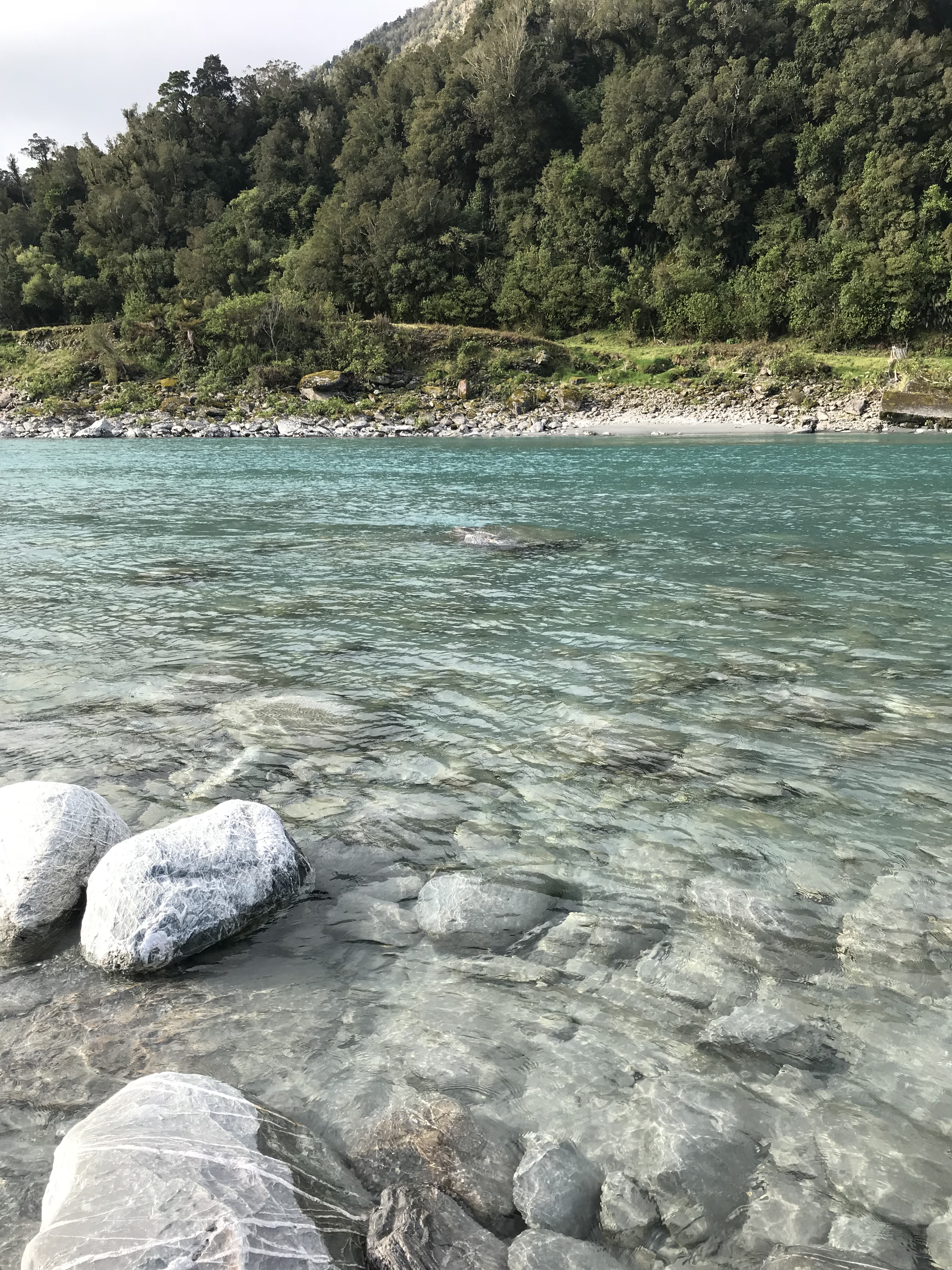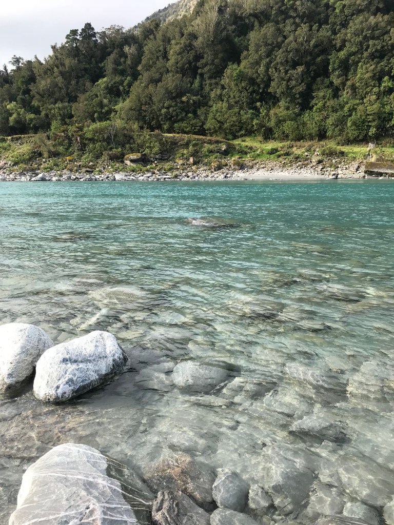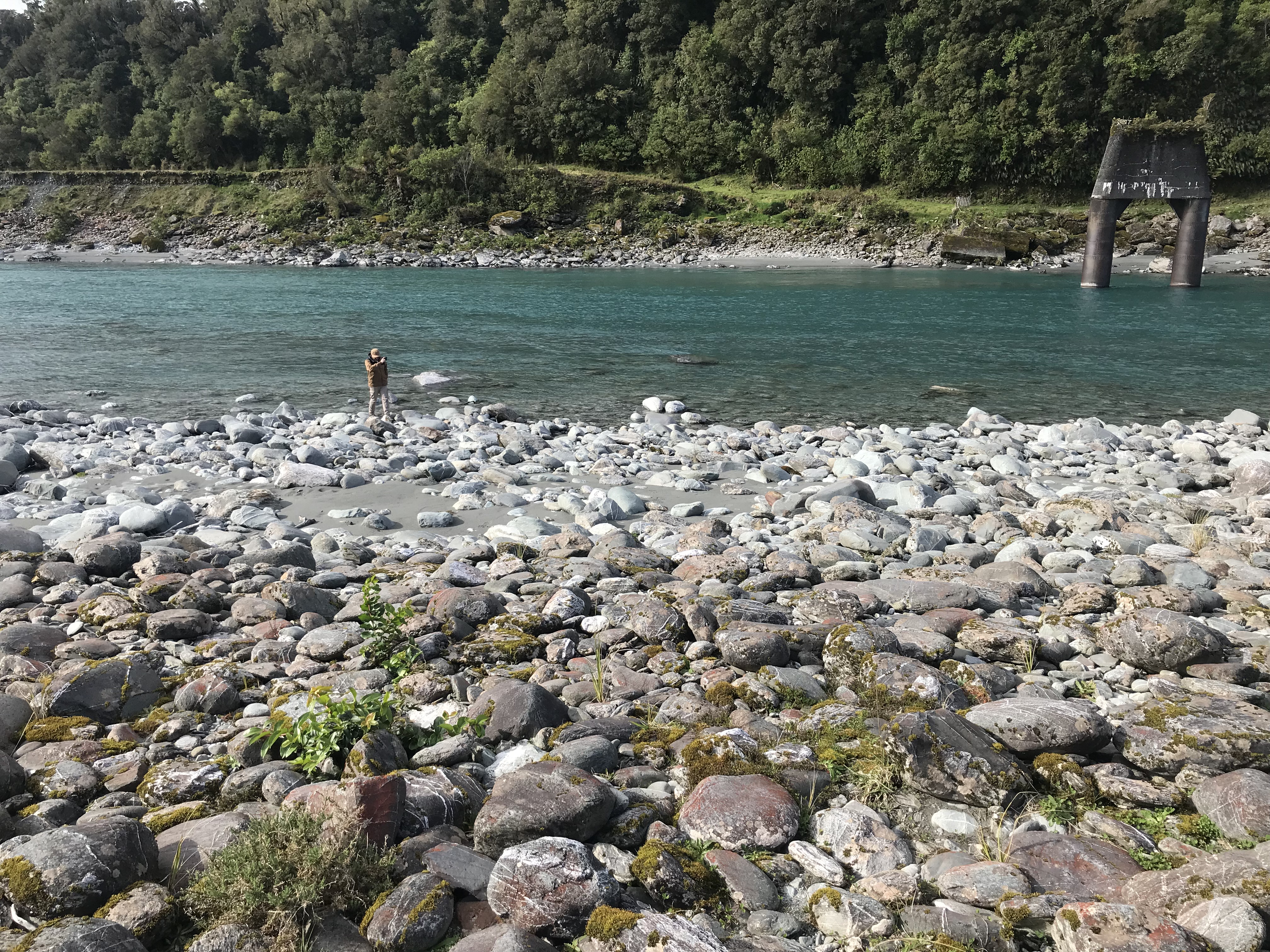 Mais um lago/rio no nosso caminho e uma parada… que lugar maravilhoso!!! Aí começou a ficar diferente… a cor da água era inacreditável… um azul/transparente maravilhoso… a água em alguns lugares fica assim porque é água do degelo das montanhas. Este rio fica entre Okarito e Franz Joseph, e chama-se “Whataroa River” (do lado do Glacier Country Scenic Flights). Absolutamente deserto, absolutamente maravilhoso.