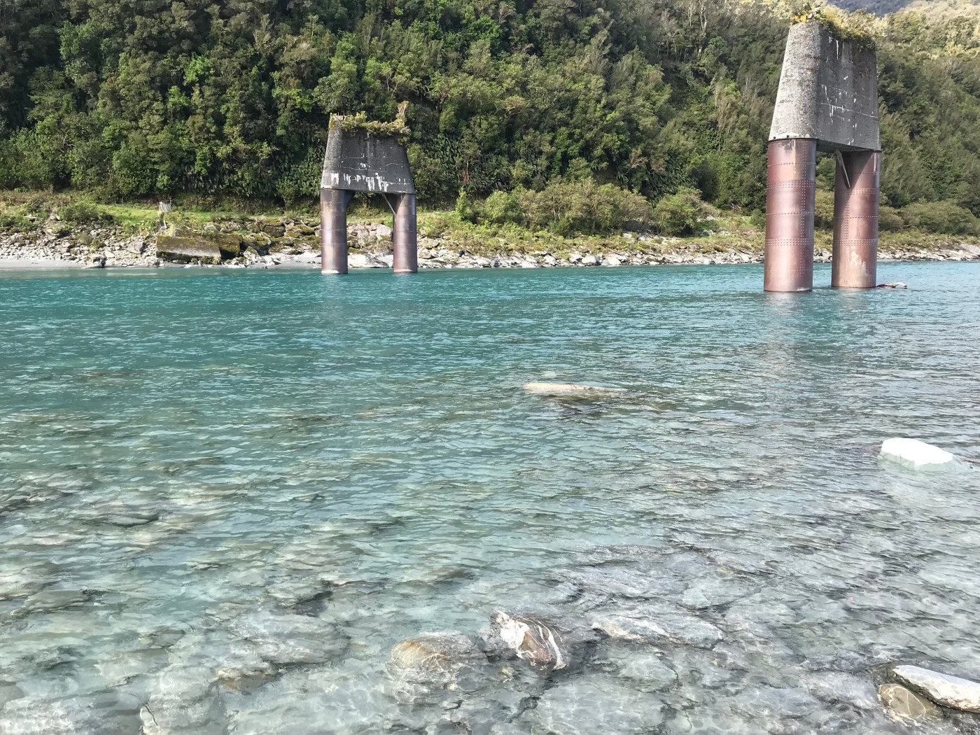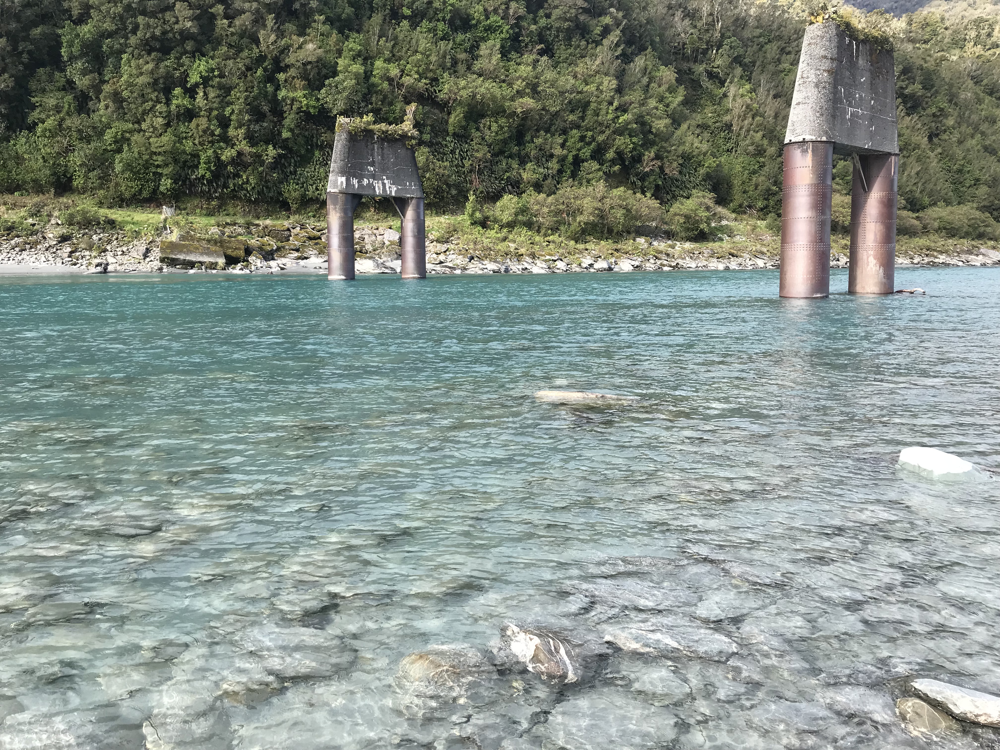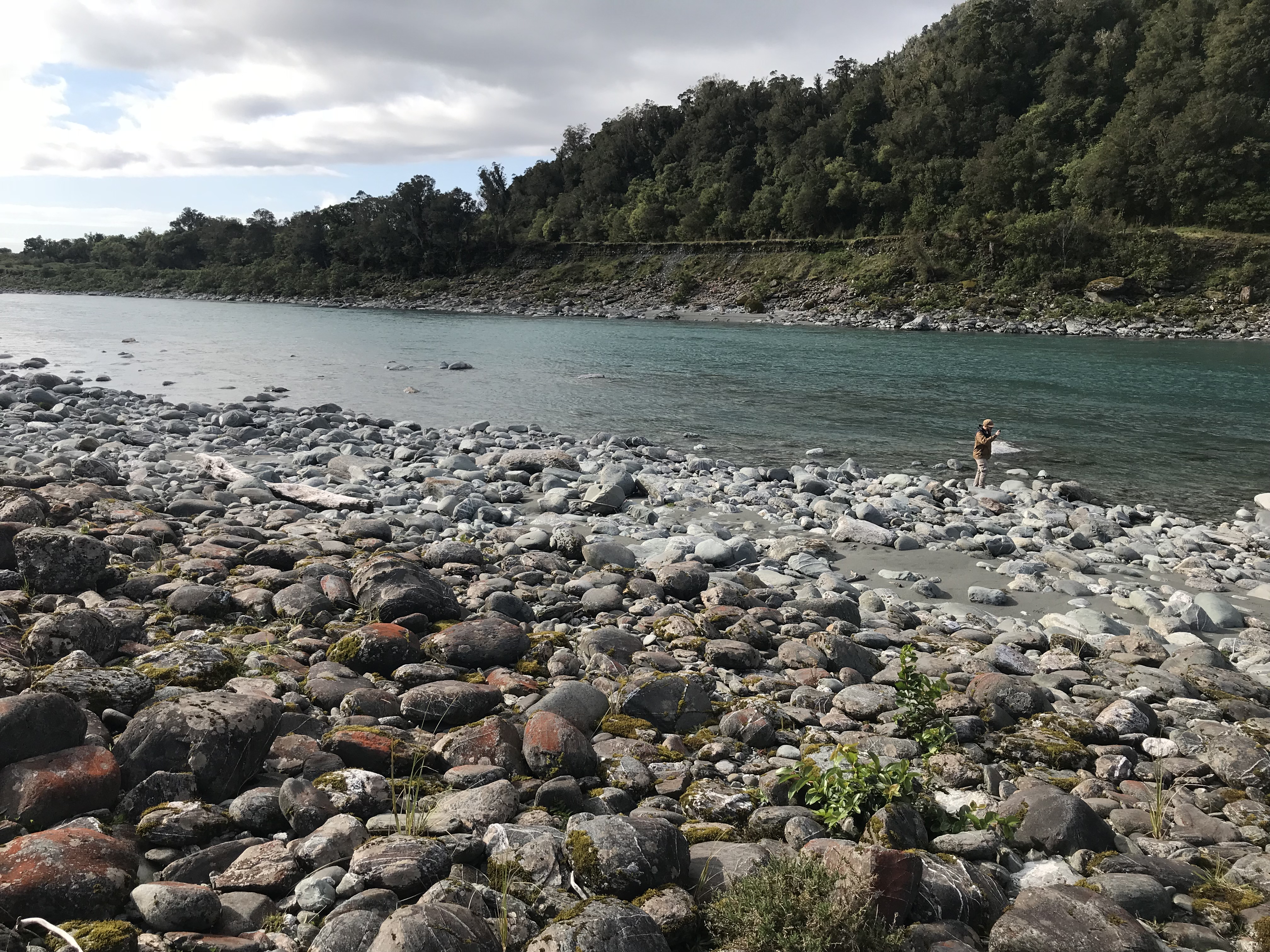 Mais um lago/rio no nosso caminho e uma parada… que lugar maravilhoso!!! Aí começou a ficar diferente… a cor da água era inacreditável… um azul/transparente maravilhoso… a água em alguns lugares fica assim porque é água do degelo das montanhas. Este rio fica entre Okarito e Franz Joseph, e chama-se “Whataroa River” (do lado do Glacier Country Scenic Flights). Absolutamente deserto, absolutamente maravilhoso.