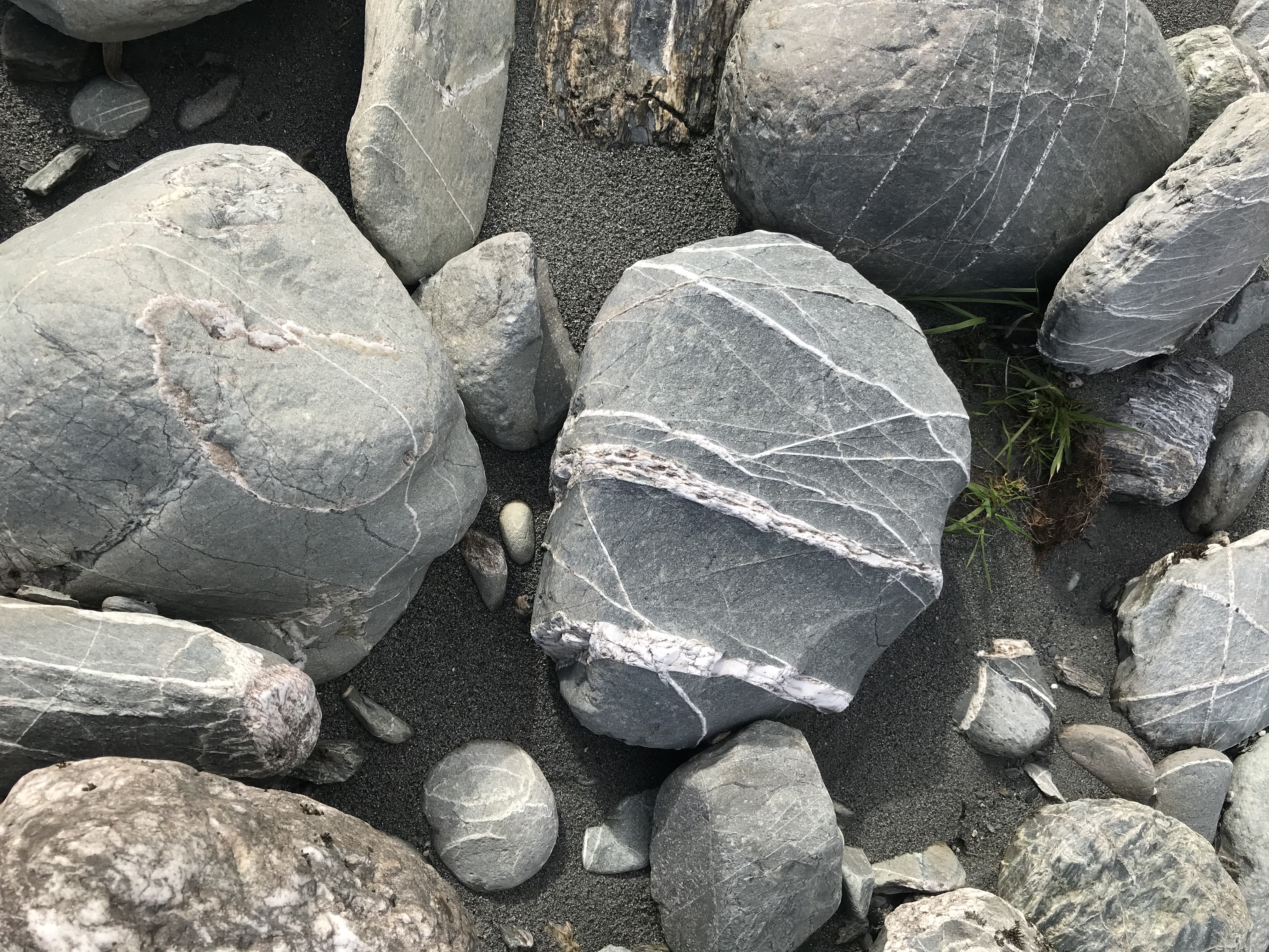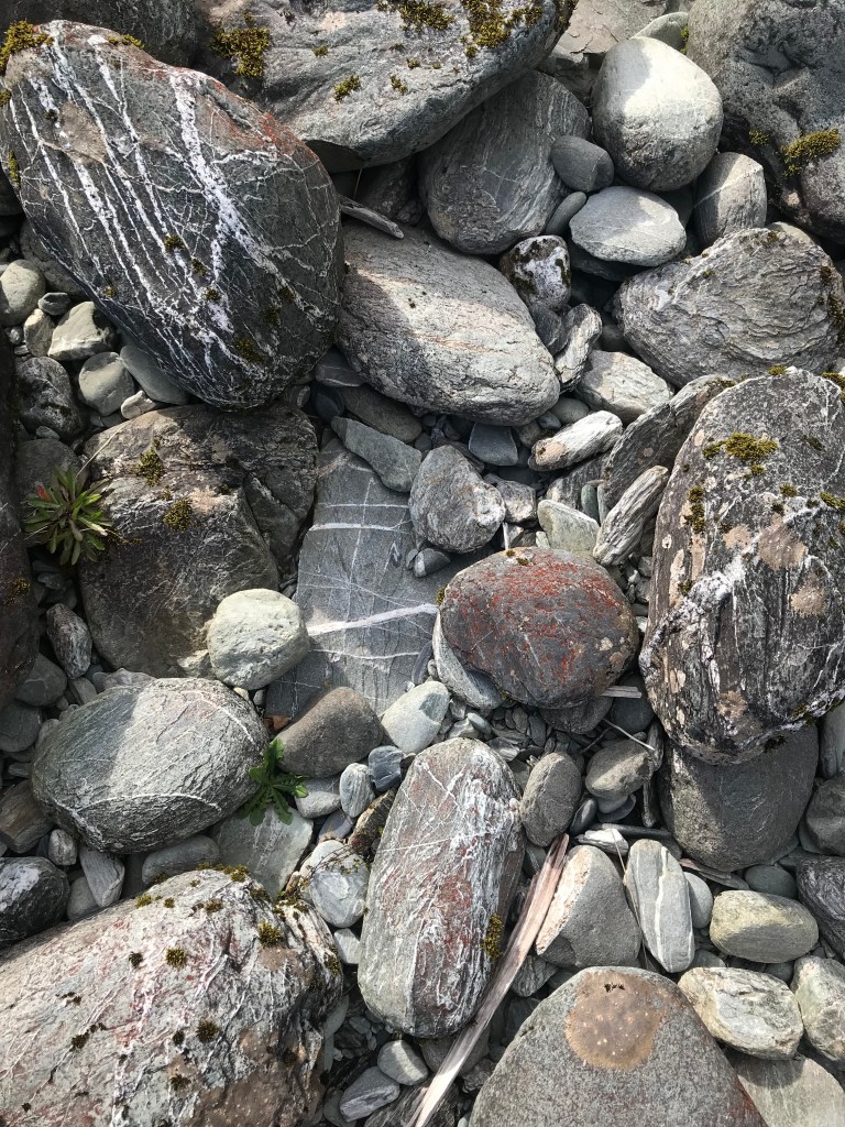 Uma coisa muito interessante de observar são as pedras que ficam nas margens… pequenas e grandes, todas cinza escuro riscadas de branco… pareciam pinturas, respingos de tinta.